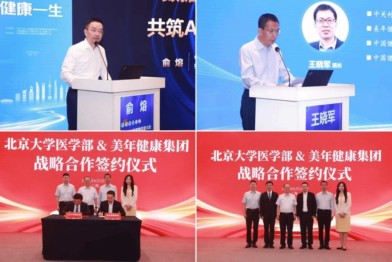 分会场上半场为美年健康蓝皮书发布会,由主动健康分会副主任委员、健康管理分会常务副主任委员、中关村美年健康产业研究院王晓军院长主持。健康管理分会主任委员、美年大健康产业控股股份有限公司董事长俞熔博士围绕“数据驱动·科技创新——共筑AI健康管理新时代”作专题报告。随后,北京大学医学部与美年健康集团完成战略合作签约,双方将深度推进资源整合与优势互补,依托健康体检领域的大数据资源,为主动健康理念在全人群范围内的精准落地提供有力支撑。北京大学医学部肖渊副主任、美年大健康产业控股股份有限公司俞熔董事长代表双方签约。中国健康促进与教育协会会长、北京大学公众健康与重大疫情防控战略研究中心主任、北京大学医学部美年公众健康研究院院长李立明教授、北京大学公共卫生学院党委书记郝元涛教授、美年健康集团董事王晓军以及美年健康集团高级副总裁江颖共同见证了本次签约仪式。
