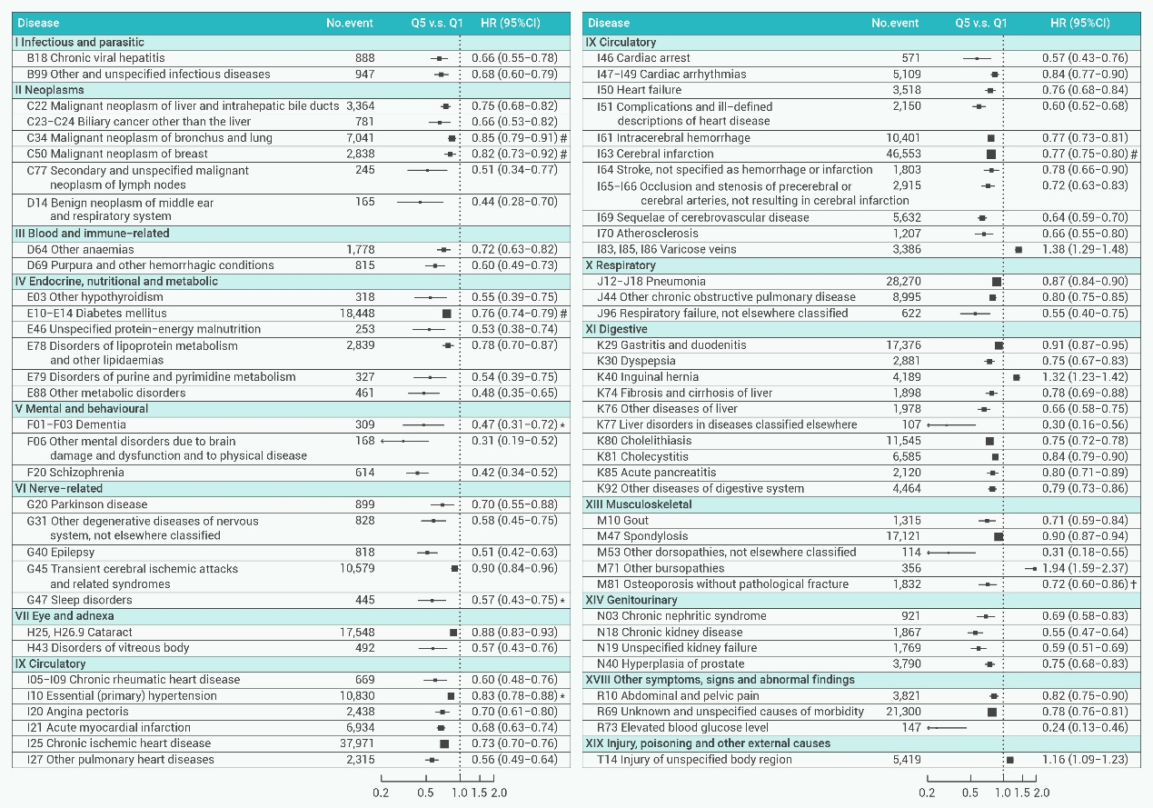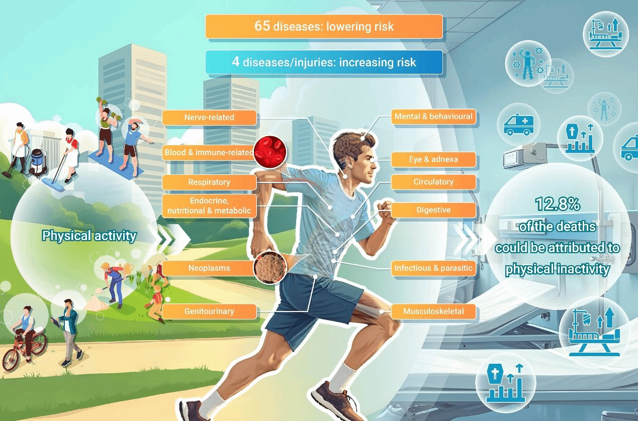 研究根据身体活动水平将人群分成五组,结果显示,高身体活动水平与广泛的疾病发生风险降低相关。与最低组相比,最高组患任何疾病的风险降低14%,全因死亡风险降低40%。高身体活动水平与14大类(国际疾病分类章节)的风险降低显著相关,涵盖65种不同疾病和19种死因;其中54种疾病未被WHO身体活动指南列为对政策决定重要或关键的疾病。新发现的这些身体活动相关疾病主要分布在精神和神经系统疾病、眼科疾病、代谢性疾病、呼吸系统疾病、消化系统疾病、肾脏疾病、骨骼肌肉疾病等。此外,研究还发现高身体活动水平与4种疾病风险升高相关。