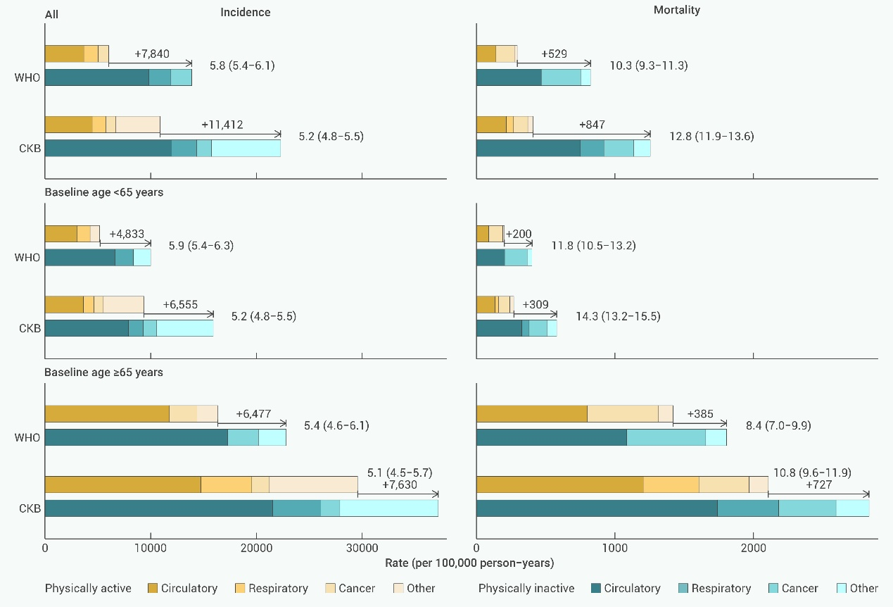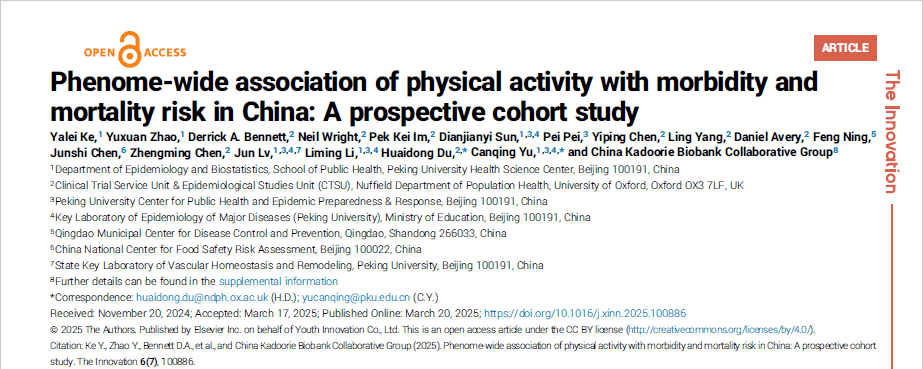 2025年3月20日,《The Innovation》在线发表了CKB团队题为“Phenome-wide association of physical activity with morbidity and mortality risk in China: A prospective cohort study”的研究。这项全表型组关联研究通过对50万中国人历时12年的随访发现,身体活动与中国成人65种发生风险和19种死因死亡风险降低相关,是维护健康的“灵丹妙药”。