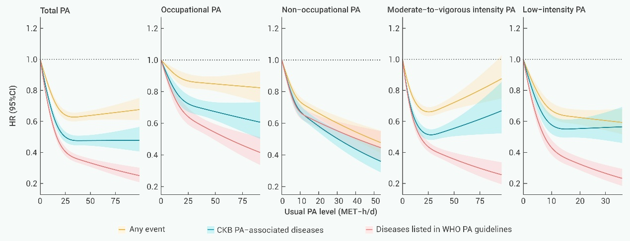 研究进一步探讨了不同领域和强度的身体活动对健康的影响。发现无论是工作相关还是非工作相关身体活动,均与多种疾病风险的降低相关。值得注意的是,既往研究较少关注的低强度身体活动,也与20多种疾病风险降低显著相关。而除了中高强度身体活动与疾病风险呈U型关联外,其他类型和强度的身体活动与疾病风险均呈L型关联。这表明,随着身体活动水平的增加,疾病风险逐渐降低,但过量的中高强度身体活动可能会减弱其健康效益。