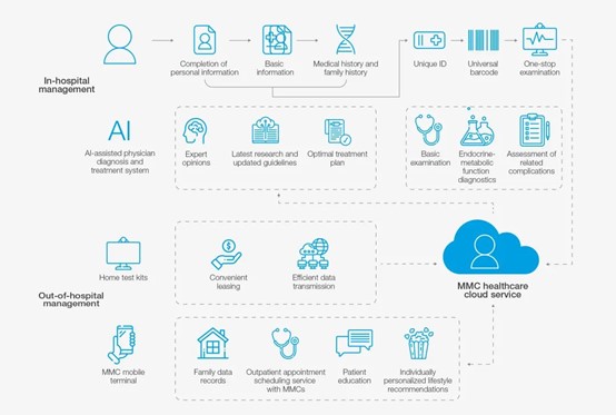 国家标准化代谢性疾病管理中心(MMCs)为糖尿病患者提供了“一站式服务”,将挂号、风险评估、全方位检查、诊断治疗、取药与健康教育在同一地点完成,有效简化糖尿病患者复诊流程。并且医护人员和患者都能在云平台上看到患者体检信息,以实现及时精准干预。MMCs形成了国家-地区-县-社区的四级防控体系,以区县医疗机构负责诊断与初步治疗,联动多个社区机构负责筛查和高危人群管理的“1+X”医疗模式,使得MMCs能够提供高效的随访和疾病管理。
