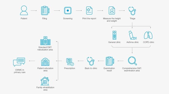 咳喘管理中心(CWMCs)建立了疾病的全程管理模式,以提高呼吸系统疾病患者的生命质量。呼吸系统疾病面临着误诊或漏诊、患者自身的重视程度不够、随访不充分的问题。为此,CWMCs要求患者填写问卷并进行诊断前的风险评估与筛查,提升患者对自身健康的重视度、随访和治疗依从性,并且提高了医生诊断的准确性。同时,CWMCs对患者进行长期随访与治疗,并且进行健康教育,实现从家到医院闭环管理模式,提升患者的依从性。