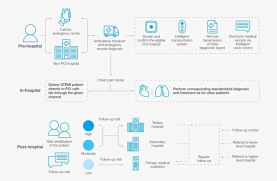 胸痛中心(CPCs),实现了“将急性胸痛患者送入具有高水准治疗的医院,并尽快进行治疗”的目标,有效压缩了患者从发作到进行经皮冠脉介入治疗(PCI)的时间,挽救了急性心梗患者的生命。CPCs模式中,构建了国家-省市-各地的区域医疗网络,并借助大数据实现不同等级医疗机构之间的信息共享;针对不同层级的医疗机构制定相应的医疗服务标准,整体提升了服务质量;高危患者将被分配到高级别医院,而中低风险患者则转入基层医疗机构,实现医疗资源的合理分配。