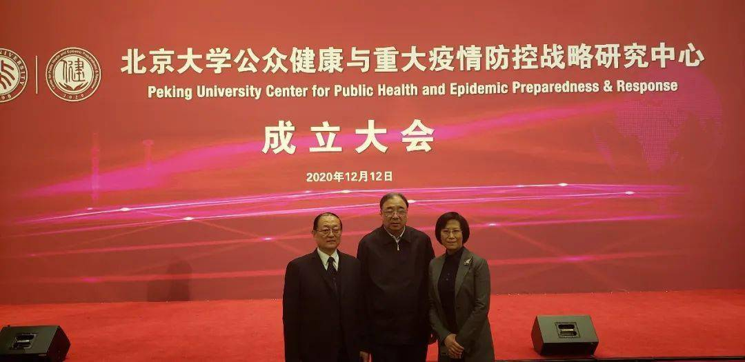 北京大学公众健康与重大疫情防控战略研究中心成立大会,从左至右为:中心主任李立明、国家卫健委主任马晓伟、国家药监局副局长颜江瑛