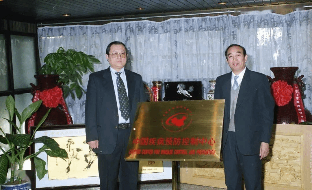 2002年1月23日,中国疾病预防控制中心成立大会在人民大会堂举行,左为首任主任李立明,右为首任党委书记朱志南