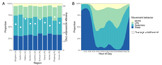 研究结果显示运动手环数据应答率(89.7%)和穿戴依从性(穿戴时间合格率:93.1%)较好,数据质量较高。研究对象的平均总体活动水平为31.1mg/天。对于4类身体行为的平均时长,累计睡眠时间为7.7小时/天(32.3%),久坐为8.8小时/天(36.6%),低强度身体活动为5.7小时/天(23.9%),中高强度身体活动为104.4分钟/天(7.2%)。活动水平在不同年龄组、性别和地区之间存在明显差异。