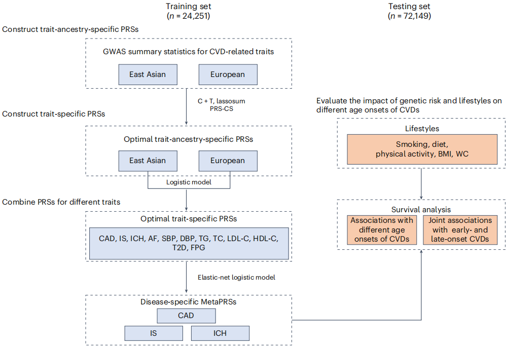 该研究基于CKB项目中10万余人的全基因组分型数据,整合心血管病及其危险因素的跨血统遗传关联信息,构建包含上百万遗传位点的PRS,并评价其与综合生活方式对早、晚发心血管病的交互作用。