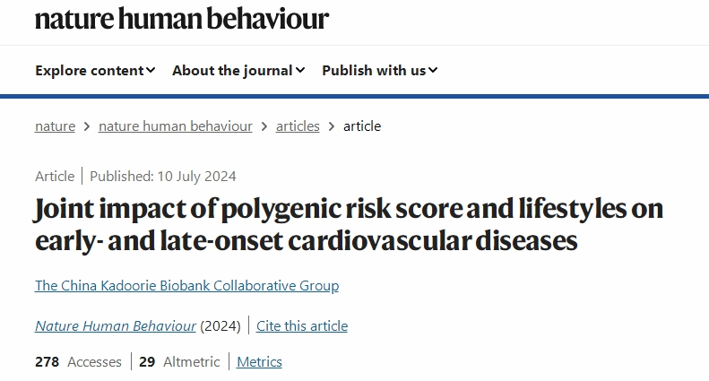 2024年7月10日,CKB项目组在《自然·人类行为》(Nature Human Behaviour)杂志在线发表了题为“多基因风险评分和生活方式对早、晚发心血管病的联合影响(Joint impact of polygenic risk score and lifestyles on early- and late-onset cardiovascular diseases)”的研究成果,该研究发现高遗传风险和不良生活方式对早发心血管病风险存在加法交互作用,提示针对具有高遗传风险的年轻人促进健康生活方式将获得更大的预防收益。
